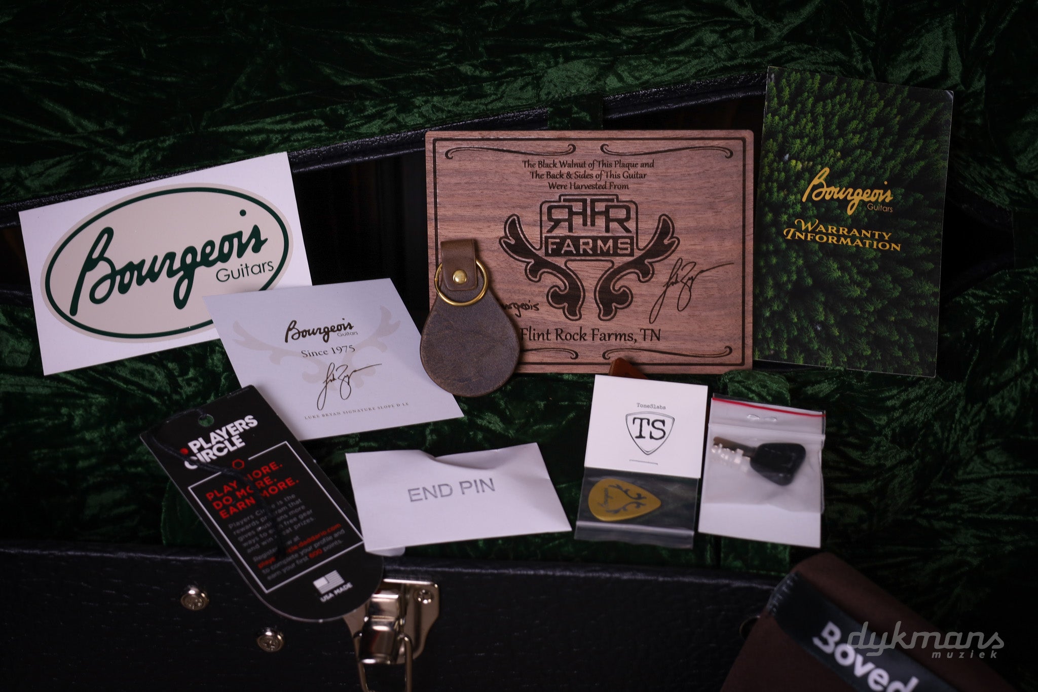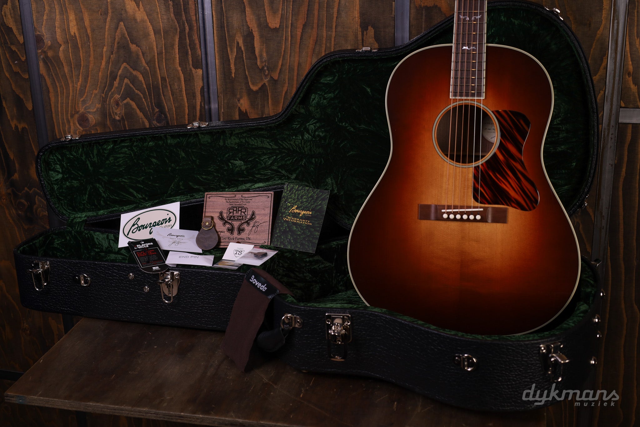 What truly makes this guitar unique is the story behind the wood: the Eastern Black Walnut for the back and sides comes directly from Bryan's own Flint Rock Farms in Tennessee. After years of drying in Dana Bourgeois' workshop, this wood has been crafted into an instrument that is both musically and historically special.