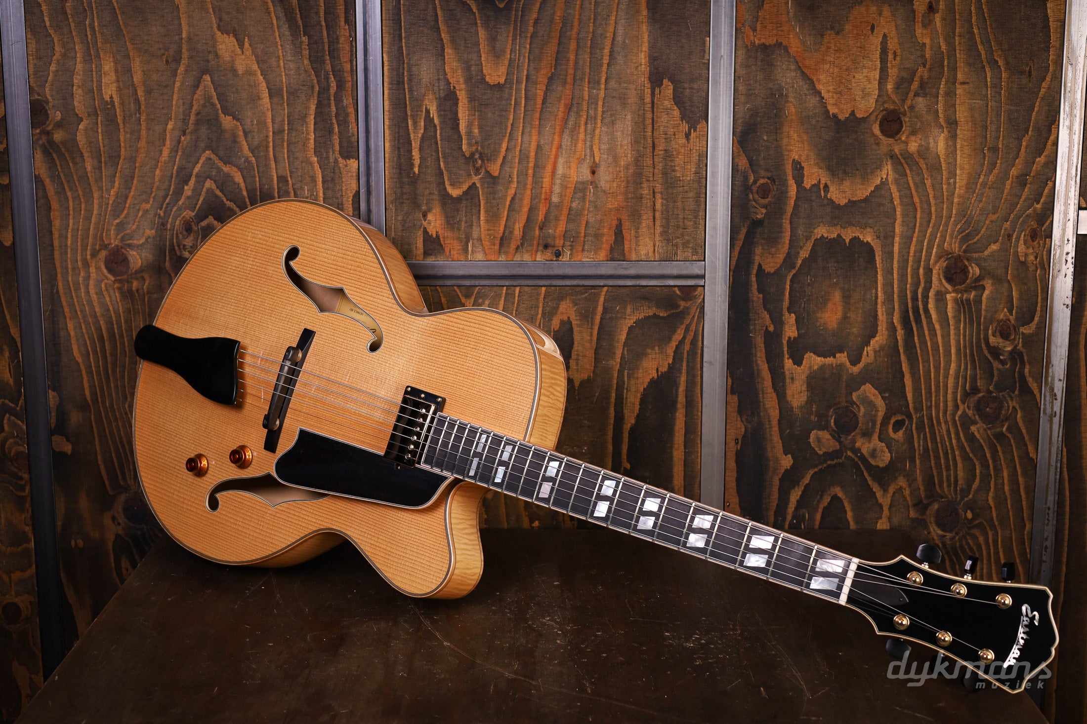 With a solid spruce top and laminated flamed maple back and sides, this guitar delivers a warm, balanced tone with plenty of definition. The three-piece maple neck with an ebony fingerboard plays smoothly and feels instantly familiar. The Seymour Duncan Jazz pickup delivers a rich, dynamic tone perfect for jazz, blues, and fusion. The ebony bridge and brass tailpiece provide extra sustain and refined resonance. Finished in a beautiful Truetone gloss with gold Gotoh tuners, this guitar exudes pure class. An instrument for the guitarist seeking craftsmanship, tone, and presence—exactly what we at Dijkmans Guitars value.