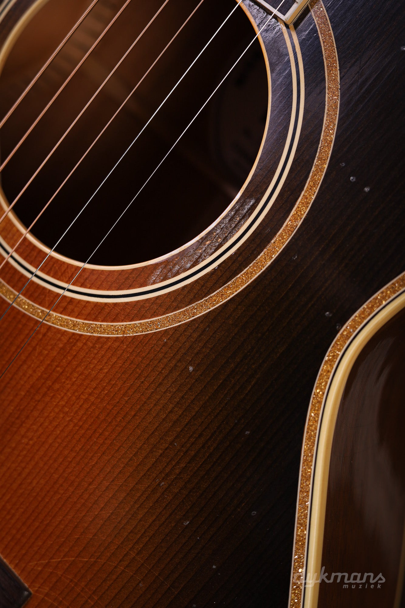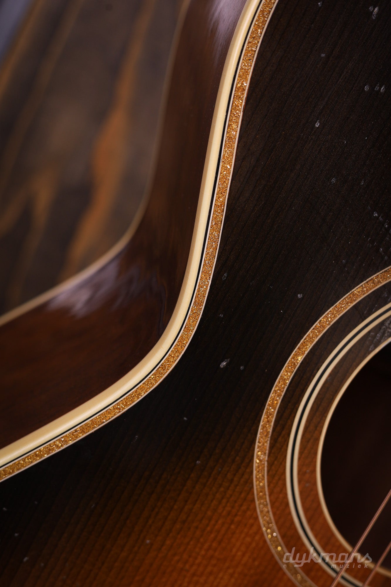 Binding & Rosette: Multiple layers of gold sparkle; L-2-style rosette with subtle gold sparkle.