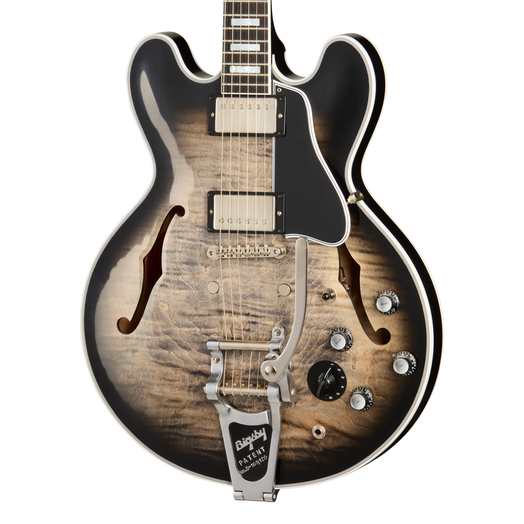 De Gary Clark Jr. De Custom ES-355 heeft een drielaagse body van esdoornhout/populierenhout/esdoornhout met een buitenlaag van gevlamd esdoornhout, een mahoniehouten hals met een 50s afgerond Medium C-profiel, en een gebonden ebbenhouten toets met 22 historische middelgrote jumbo frets en blokinlays in mother of pearl. De body en kop zijn voorzien van een meerlaagse binding, evenals de Custom split-diamond inlay en Grover® Rotomatic®-mechanieken met niervormige knoppen. Onder de behuizing zorgen twee ongepotte Custombuckers met Alnico 3-magneten voor een rijke klank. Deze zijn aangesloten op CTS®-potmeters met audiotaper en papier-in-olie-condensatoren, samen met een Switchcraft®-driewegschakelaar en een 1/4-inch jack-output. True Historic goudkleurige top hat-knoppen met aanwijsknoppen maken de bedieningselementen compleet, terwijl een mono Varitone-circuit met een zwarte chicken head-knop extra tonale flexibiliteit biedt. De hardware is van nikkel met VOS-afwerking, inclusief de ABR-1 historische brug zonder draad en Bigsby® B7-vibrato. De gitaar heeft verder een prachtige afwerking in VOS Cobra Burst. Elk instrument wordt geleverd in een harde Gibson Custom-koffer met Gary Clark Jr.-logo's, met een bruine buitenkant en een zwart pluche binnenkant.
