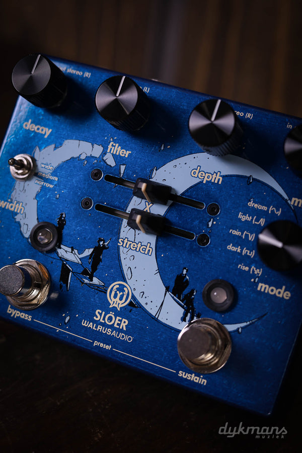 To begin with, the Sloer is fully stereo. In addition, you have access to 2 new reverb types (Rain and Light) and 2 new modulation waveshapes. A very creative new addition is the sample rate function, which allows you to adjust the sound quality of the Slöer, so to speak. If you use the Slöer in stereo, you even have control over the width of the sound. If you have put together a cool reverb, you can easily store it in one of the three reverb slots, just like in the Slötva. The Walrus Audio Slöer sounds deeper, more versatile and simply better than ever!